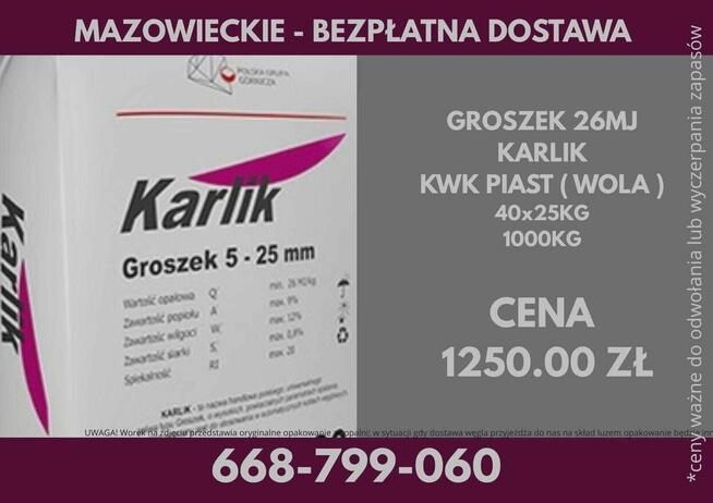 Polski Węgiel KWK PIAST ( WOLA ) : - WĘGIEL GROSZEK KARLIK 26 MJ (5-25) Paleta : 40x25kg Cena : 1250 zł ( ...